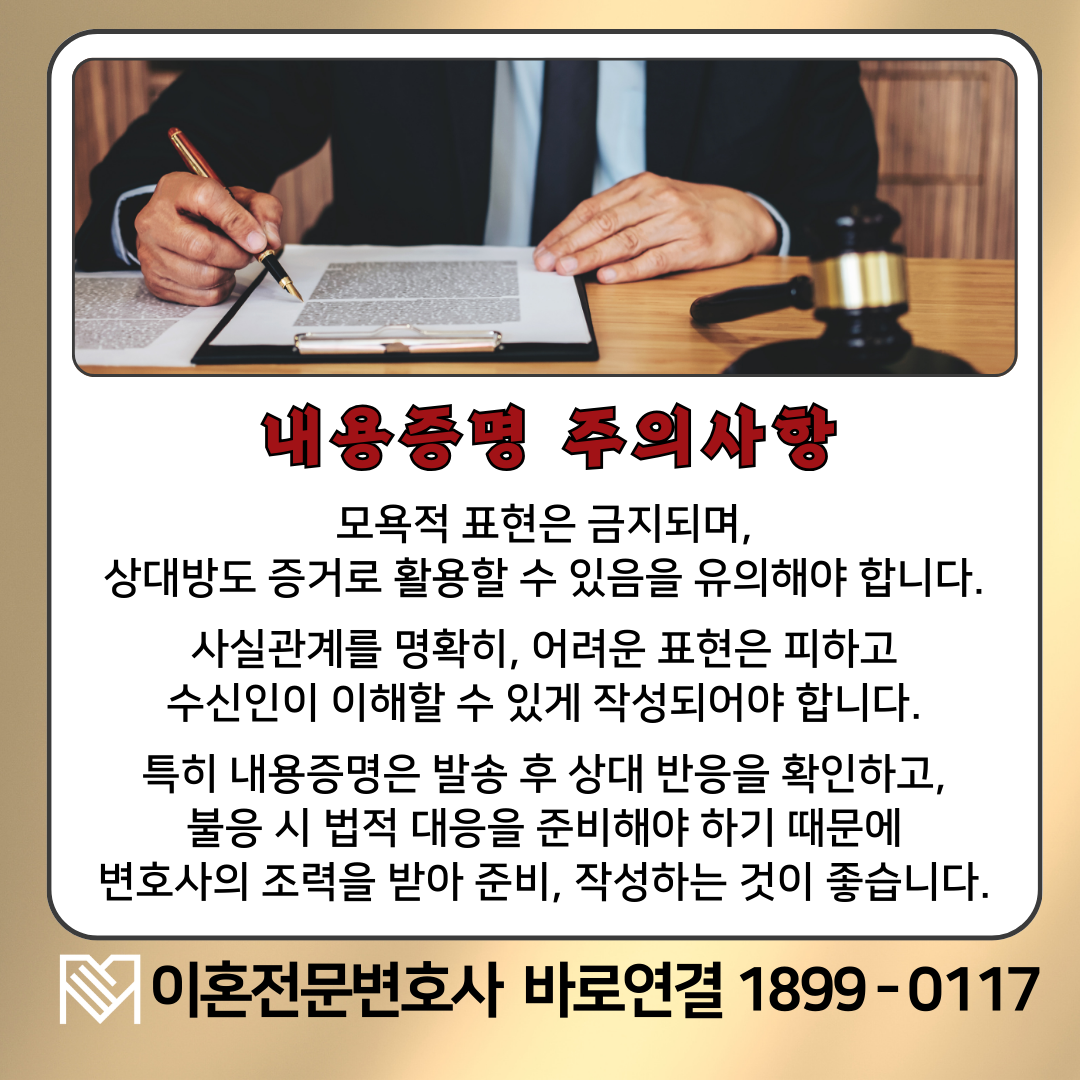 내용증명은 법적인 구속력은 없지만, 강한 경고성과 소송 시 증거로 활용하기 좋기 때문에 이혼 소송 전이나 후 배우자의 재산 은닉, 양육 관련 문제 등에 대응하는데 유용합니다.