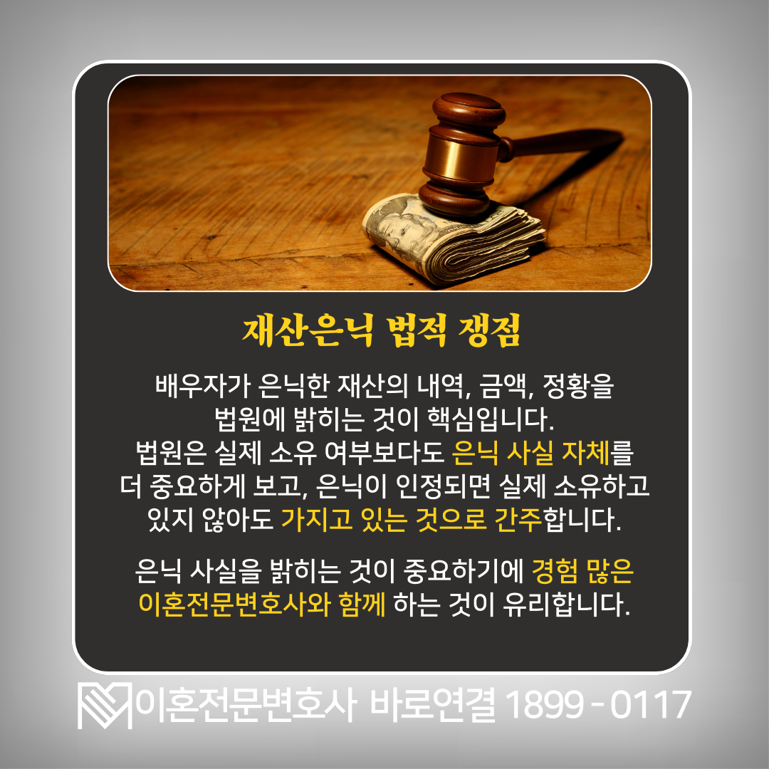 이혼하는데 배우자가 재산은닉을 한 정황이 있다면 주저 말고 연락 주시기 바랍니다.