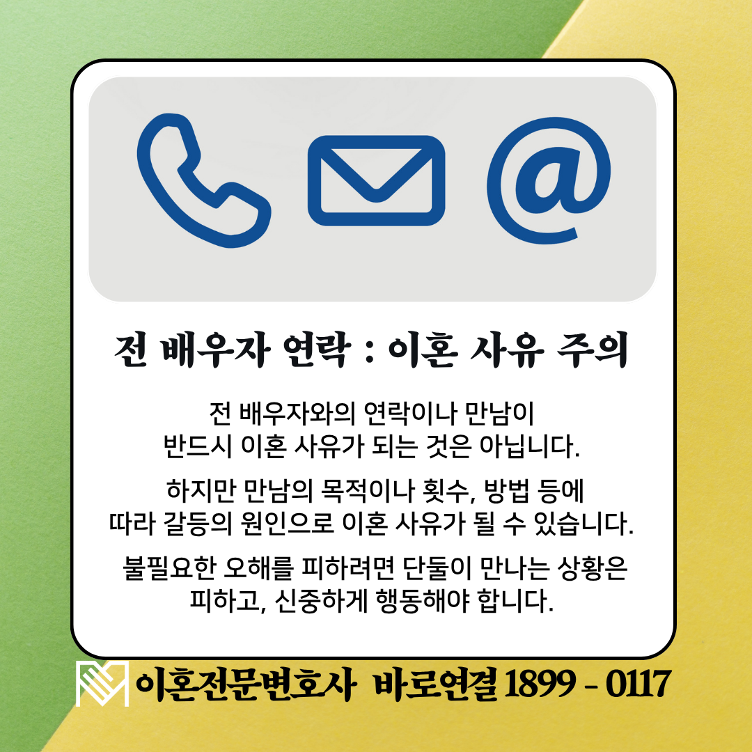 전 배우자와의 만남이 무조건 잘못된 것은 아니고, 불법적인 행위는 아니지만 그 만남의 목적, 의도, 빈도, 방식, 현 배우자의 감정 상태 등에 따라 이혼사유에 해당될 수 있어 주의가 필요합니다.