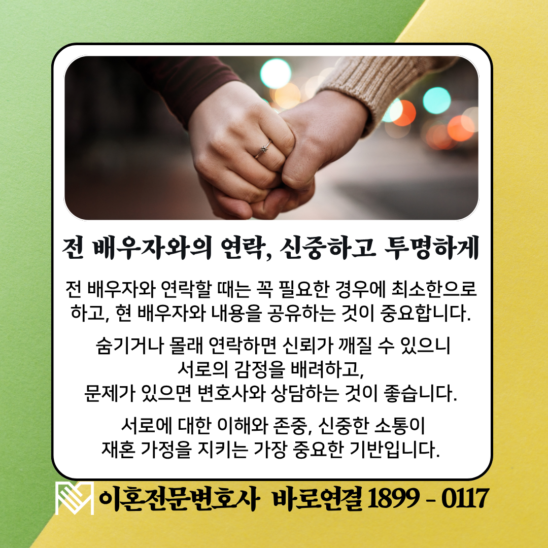 따라서 현 배우자의 입장을 배려하여, ① 전 배우자와의 연락은 꼭 필요한 일에만 하고 ② 가능한 유선보다는 메신저 또는 문서로 남기며 ③ 주고받은 내용을 공유하는 태도를 유지하는 것이 좋습니다.